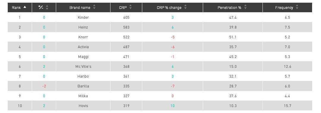 Europa es un mercado que nos toca más de cerca, aunque los hábitos de consumo difieren en cada país. No obstante, Kantar Worldpanel ha puesto al descubierto cuál es la marca de alimentación más comprada por los europeos: Kinder. Sabor, emoción y sorpresa definen los productos de Ferrero, que ha sabido ganarse la confianza de los consumidores, estando presente en casi la mitad de las familias (47%). Heinz,Knorr, Activia y Maggi consolidan su carácter ganador ocupando los siguientes escaños. A partir del sexto puesto, el ranking es menos homogéneo, con nombres como McVitie’s, Haribo, Barilla, Milka y Hovis, especializada en producción de harina y pan.
