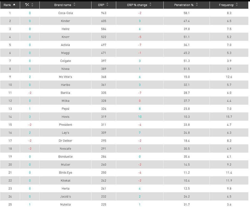 El ranking europeo mantiene el liderazgo de Coca-Cola, con un índice de penetración mayor que en el top mundial (58%). Varían el segundo y tercer puesto, aquí para Kinder, el chocolate de Ferrero, y Heinz, famosa por la extensa variedad de sus salsas. Knorr, Activia, Maggi, Colgate, Nivea, comparten listado conMc Vitie’s (United Biscuits) y Haribo, galletas y golosinas para completar los 10 primeros puestos en el viejo continente.