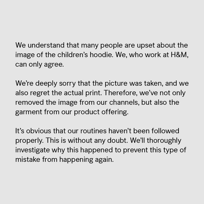 Zaherida por una auténtica vendaval de críticas, H&M ha tenido que pedir disculpas públicamente por la fotografía, que ha sido retirada ya de su web. Además, la sudadera que protagonizaba la foto ha sido retirada también del catálogo de la marca.