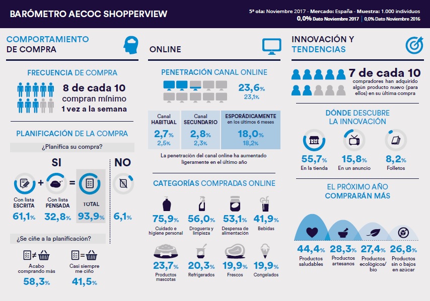 La compra semanal es la favorita por los consumidores. Ocho de cada diez españoles compran como mínimo una vez por semana, por lo que visita una media de 3,6 establecimientos al mes, según último barómetro semestral Shopperview, que elabora semestralmente AECOC para medir la satisfacción de los clientes y los principales indicadores del comportamiento de compra en Gran Consumo.