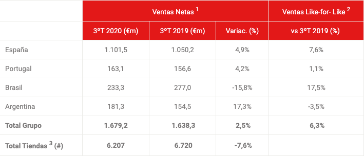 En España, las ventas netas del tercer trimestre de 2020 crecieron un 4,9% con relación al mismo trimestre de 2019, a pesar de contar con un 8% menos de tiendas y de los efectos estacionales negativos del período. La cadena registró un fuerte crecimiento Like-For-Like durante el trimestre, que representa la tasa de crecimiento de las Ventas Brutas Bajo Enseña a tipo de cambio constante de aquellas tiendas que hayan operado por un período superior a trece meses en condiciones de negocio similares.