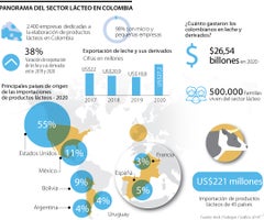 Cerca de 2.400 compañías están dedicadas a la elaboración de productos lácteos en Colombia, de ellas, 98% son micro y pequeñas, y el año 2020, pese a que tuvo la llegada de la pandemia y múltiples retos para la economía, resultó ser favorecedor para este sector, del que viven cerca de 500.000 familias, pues subieron las exportaciones y el consumo local, que superó $26 billones en gasto.