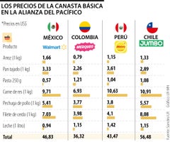 De acuerdo con los datos encontrados, la canasta es más costosa en Chile pues tiene un valor total de US$56,48. En cambio, el país donde la canasta es más barata es Colombia, ya que el valor total es US$36,32. En los otros miembros de la Alianza del Pacífico, esta canasta básica en Perú cuesta US$43,47, mientras que en México vale US$46,83.