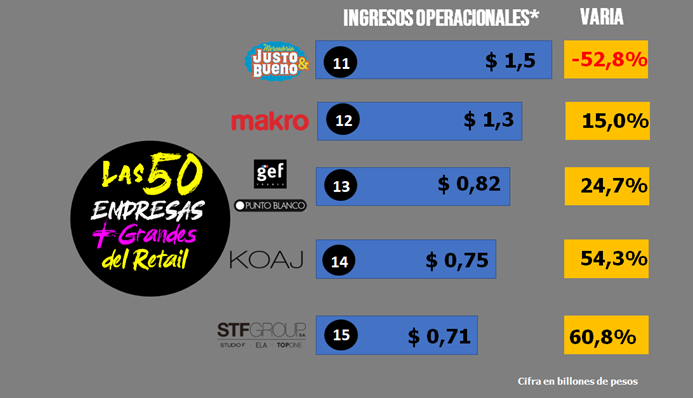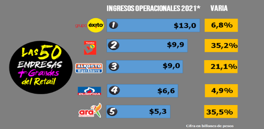 Olímpica y Tiendas Ara completan el Top 5 con ingresos de $ 6,6 y $5,3 billones respectivamente.