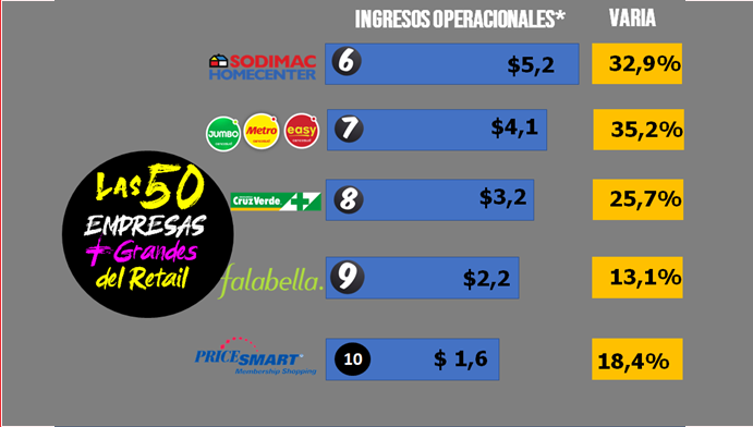 La Chilena Homecenter lidera el ranking de tiendas por departamento con unas ventas de $ 5,2 billones y un crecimiento del 32%. Falabella empresa hermana de la anterior ocupa el segundo lugar con una facturación de $ 2,2 billones y un crecimiento del 13%. La tradicional Panamericana Librería y Papelería ocupa el tercer lugar con una facturación $ 647.053 millones y un crecimiento del 16%. Mientras Almacenes Flamingo y Muebles Jamar completan el Top 5 con unas ventas de $ 541.794 millones y $ 406.897 millones respectivamente. En esta categoría se encuentran también Pepeganga y Homesentry ocupando el sexto y séptimo lugar.