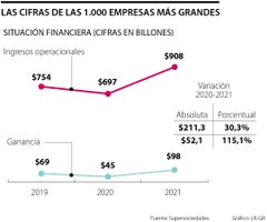 La Superintendencia de Sociedades presentó ayer el informe anual de las 1.000 empresas más grandes del país, según su desempeño financiero. El estudio arrojó que los ingresos de las compañías más grandes aumentaron, pasando de $697 billones en 2020 a $908 billones el año pasado, lo que representa una variación de 30,3%.