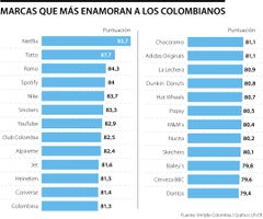 En ese sentido, de acuerdo con un estudio de Vmly&r Colombia, agencias de publicidad y comunicaciones a través del estudio Brand Asset Valuator (BAV), el ranking de las 25 marcas que más conquistan a los colombianos son: Netflix con 97.3 puntos, le siguen las colombianas Totto con 87.7 y Ramo con una puntuación de 84.3. En ese mismo top se encuentran Spotify y Nike, quienes tuvieron 84,0 y 83.7, respectivamente.