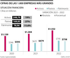 Las 1.000 empresas más grandes de Colombia también aumentaron sus activos en 2022, entre un año y otro pasaron de $1.304 billones a $1.552 billones, un crecimiento de 19,08%, mientras que la superintendencia calcula que la tasa de crecimiento promedio en cinco años llega a 10,49%. La cifra equivale a $88 billones más que el PIB nacional de 2022, que llegó a $1.464 billones.
