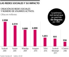 Desde entonces han salido varias plataformas que han perdurado en el tiempo, tales como Facebook (2004), Twitter, X (2006), WhatsApp (2009) e Instragram (2010). Actualmente, Facebook es la red social que más tiene usuarios registrados, lo que equivale a más de 2.900 millones de internautas activos a corte de enero de 2023, de acuerdo con datos de Statista. Esta plataforma fue la primera en sobrepasar los mil millones de cuentas registradas.