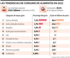 La Cámara de la Industria de Alimentos de la Andi (Asociación Nacional de Empresarios de Colombia) reveló que en 2022 el gasto en alimentos alcanzó $242,5 billones, lo que representa 39,2% de los ingresos familiares.
