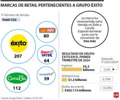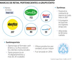 Gráfico LREntre los objetivos que tenía el holding está el de reconvertir a las marcas Éxito y Carulla 40 tiendas de Surtimax, Super Inter y Supermayorista, cadenas pertenecientes a la empresa y con las cuales busca competir en los segmentos de bajo costo y clientes institucionales, de forma respectiva.