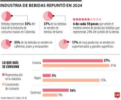 Gráfico LRDesglosando las cifras, lo que más consumen los colombianos es cerveza, que representa 37% de las bebidas consumidas, y representa 41% del crecimiento de ese segmento de productos. Le siguen las gaseosas con 16% de lo ingerido y las aguas también han subido 5%.