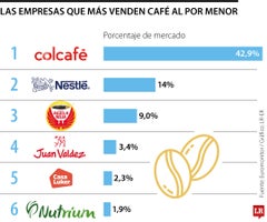 Las cifras de la firma revelaron que la Industria Colombiana de Café SA, Colcafé, es líder en la participación de mercado, con una cuota de ventas al por menor de 43%. El podio lo completan Nestlé de Colombia SA y Torrecafé Águila Roja, con 14% y 9%, respectivamente. En el listado también están Procafecol SA (Juan Valdez), con 3,4%, y Casa Luker, con 2,3%.