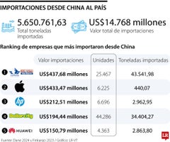 Varias empresas tecnológicas son las compañías que más importan, si lo medimos en millones de dólares, desde China rumbo al país. En 2023, estos bienes de precios altos, como teléfonos celulares, computadoras y accesorios, fueron traídos por más de US$980 millones.