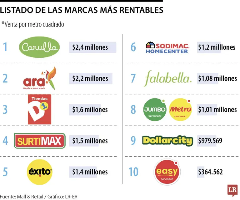 Carulla se destacó como la líder en ventas por metro cuadrado, para llegar a más de $2,4 millones. En segundo lugar se encuentra Ara con ventas por metro cuadrado de $2,2 millones. Mall & Retail mencionó que Ara ha logrado consolidarse como una cadena importante dentro del comercio minorista, ya que maneja precios competitivos y un surtido más amplio dentro del modelo hard discount, manifestó.