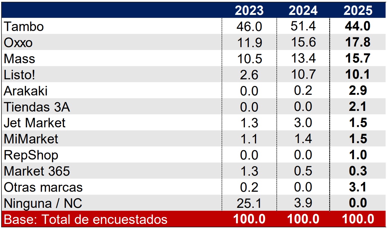 El ranking de tiendas del estudio Top Brands 2025 revela una alta concentración en la recordación de marcas. Solo tres —Tambo, Oxxo y Mass— superaron el 10 % de menciones, mientras que el resto se mantiene por debajo de ese umbral. Este patrón indica que los consumidores asocian el formato de tiendas principalmente con un grupo reducido de marcas reconocidas y con amplia presencia a nivel nacional.